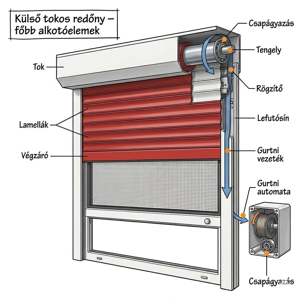A redőny több egymáshoz kapcsolódó elemből áll, amelyek együtt biztosítják a működést. A legfontosabb részek a tok, a tengely, a lamellák, a lefutósínek és a működtető rendszer (gurtni vagy motor).