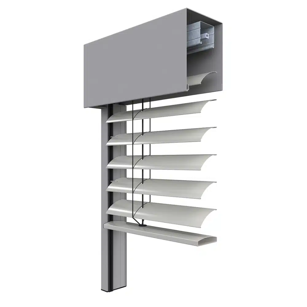 A komplett szerkezet egy erős felső tokra épül, amely diszkréten illeszkedik a homlokzathoz. Ez nemcsak a beépítést egyszerűsíti, hanem hosszú távon is megbízható működést garantál, ellenállva az időjárás viszontagságainak.